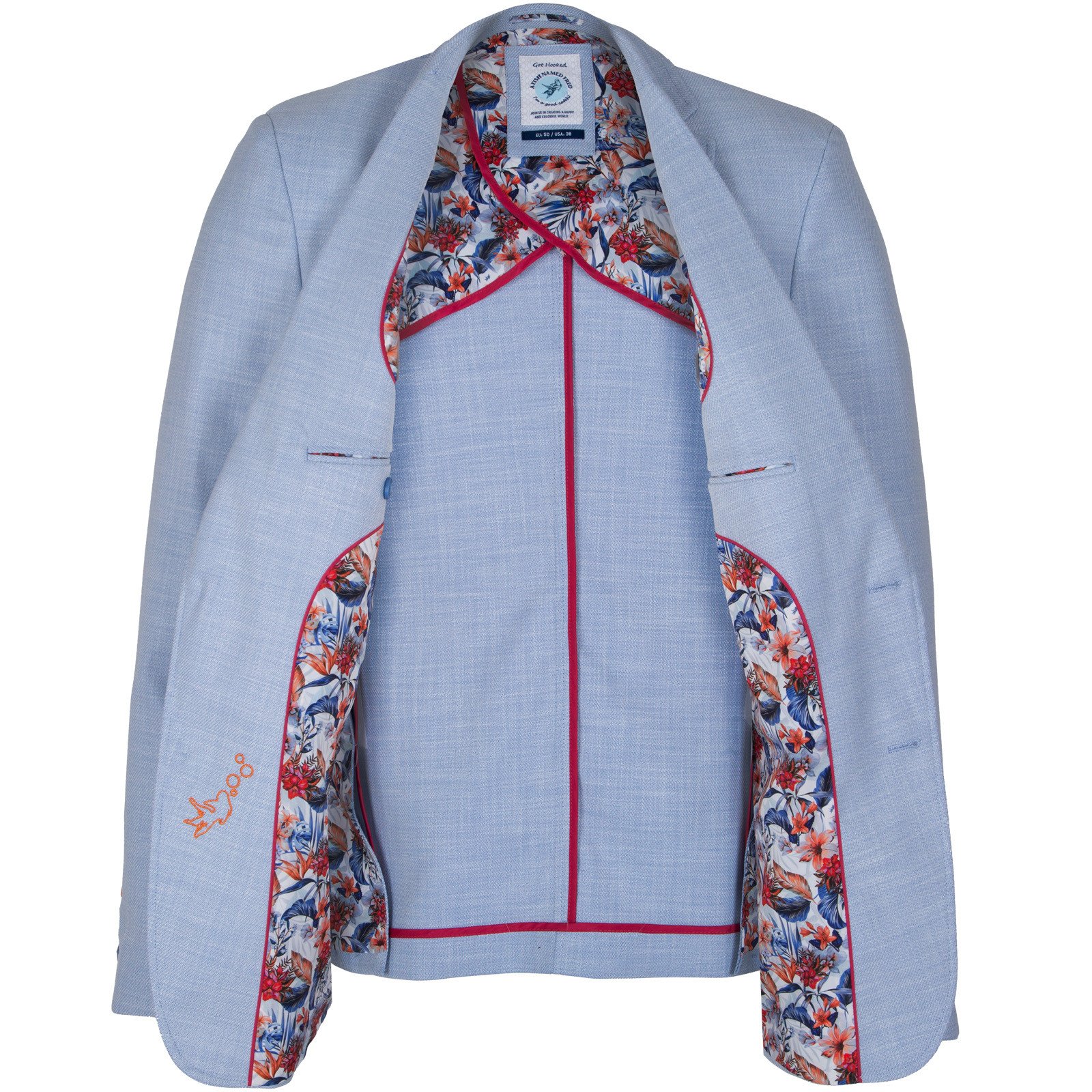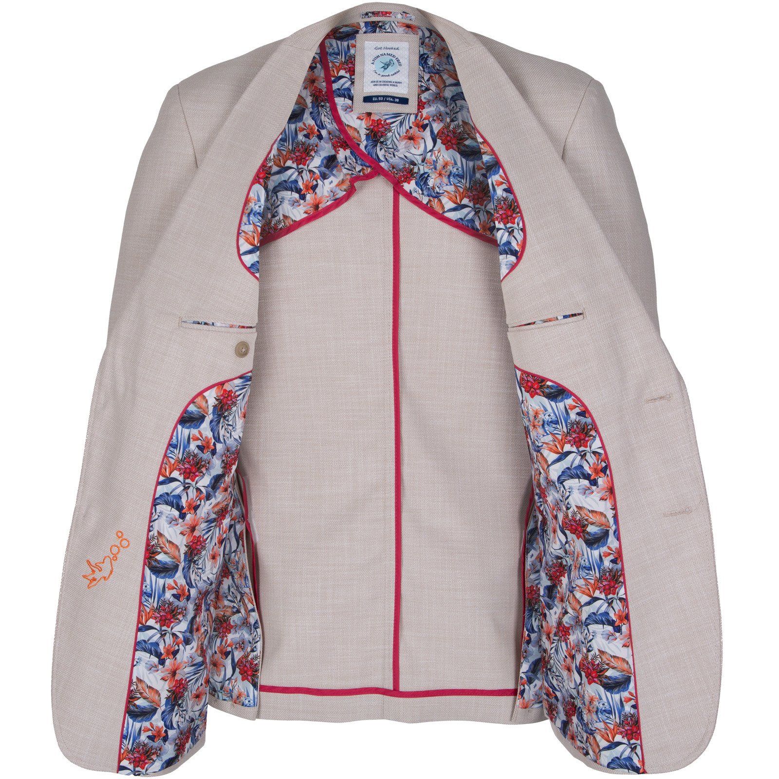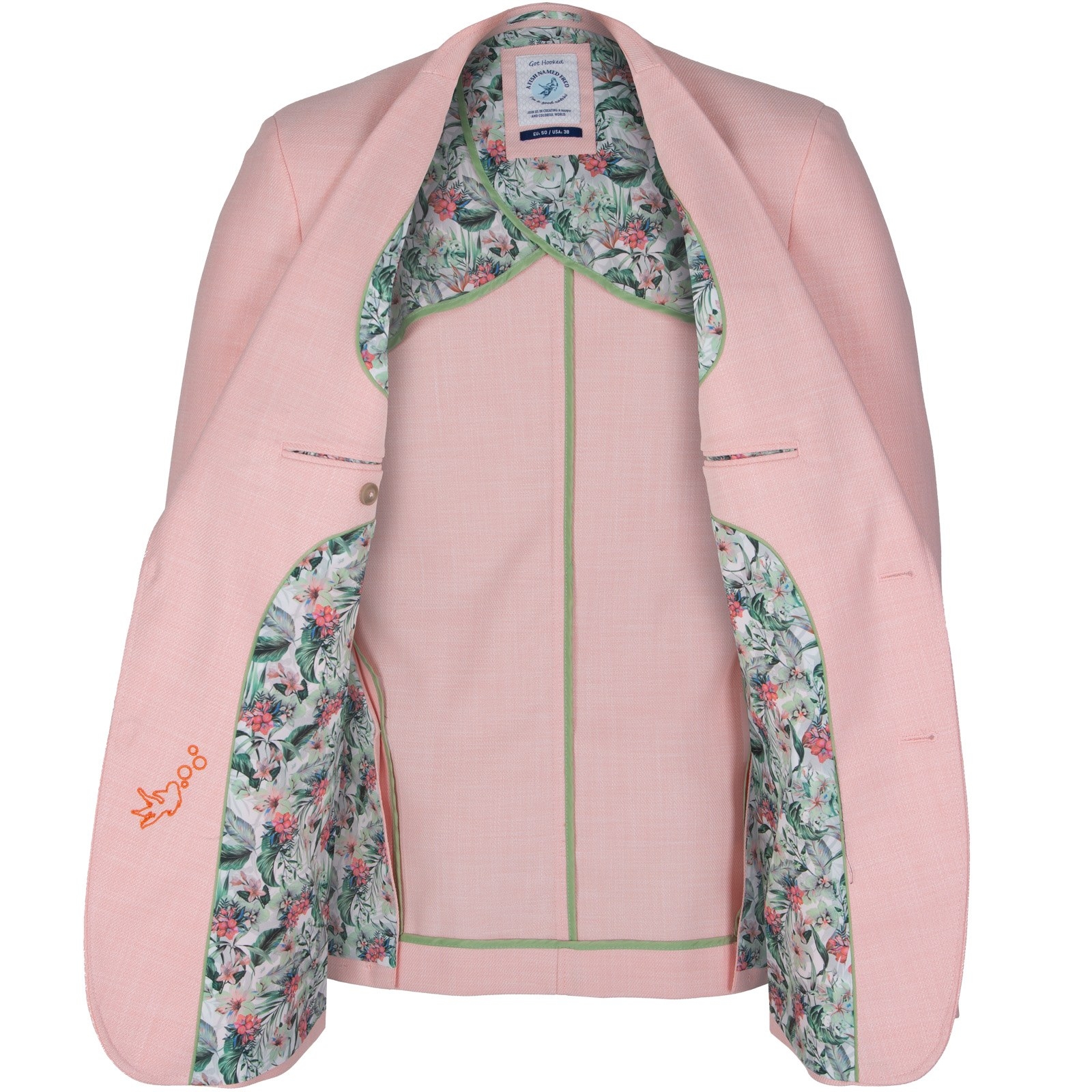 Full of little details and clever trims, this colourful light-weight blazer is a fun piece that is so versatile. Features colourful print lining, with internal pockets, a secret pocket square, a fish hook lapel pin and feature contrast button detail.