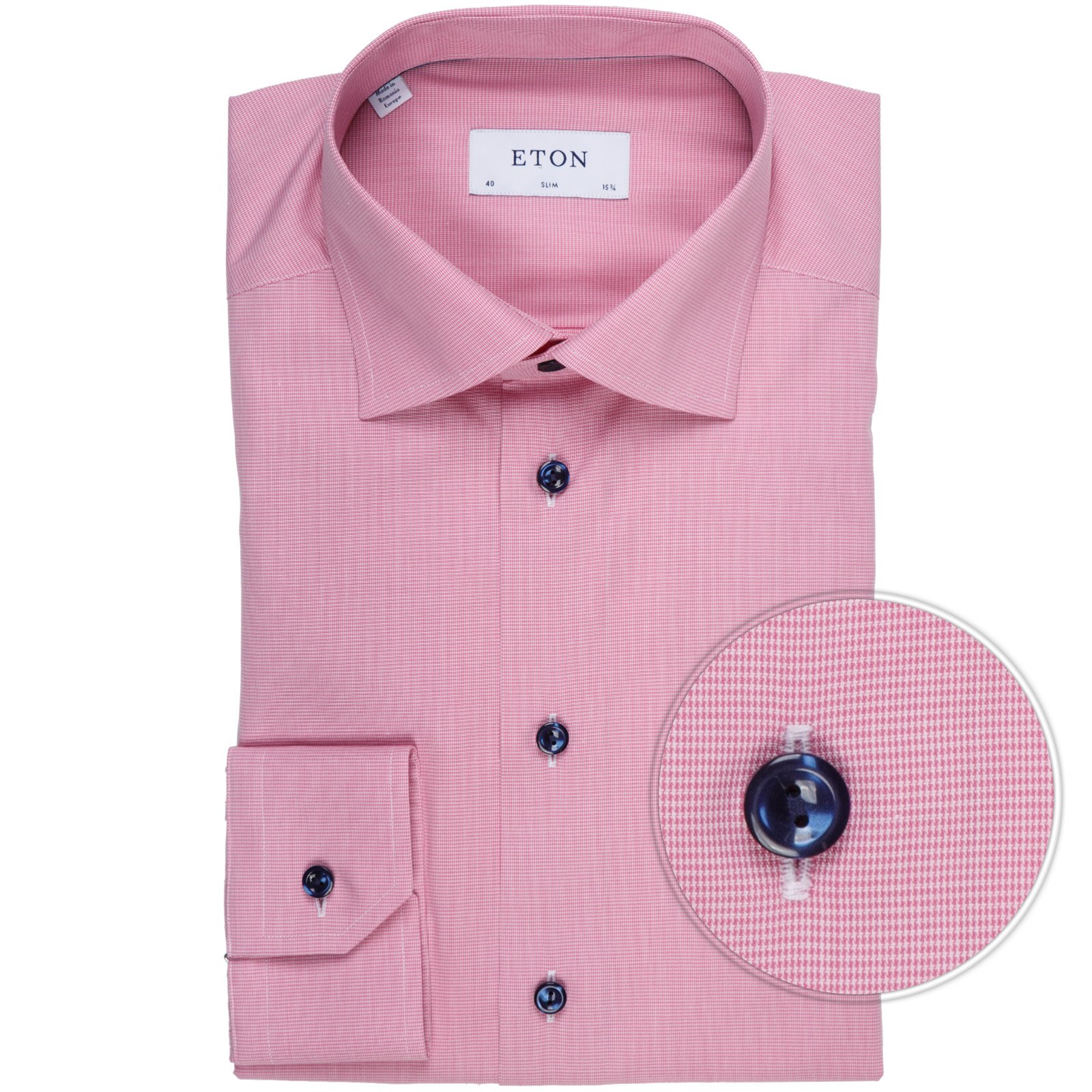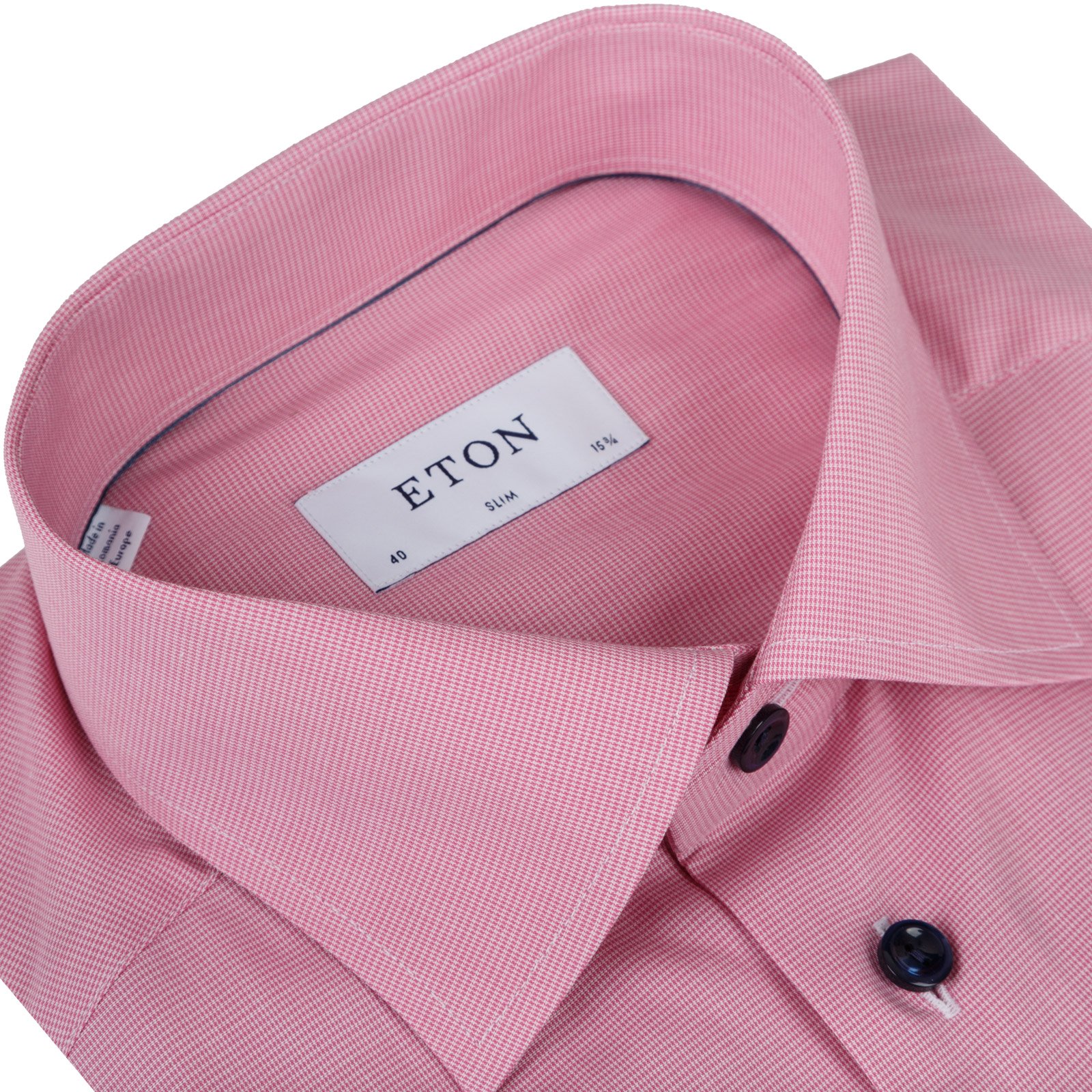 Slim fit dress shirt in a luxury cotton micro check with contrast navy buttons. Features darts in the back for a tapered fit. Double button cuffs with extra button hole for cufflinks. Modern spread collar with fixed bones.
