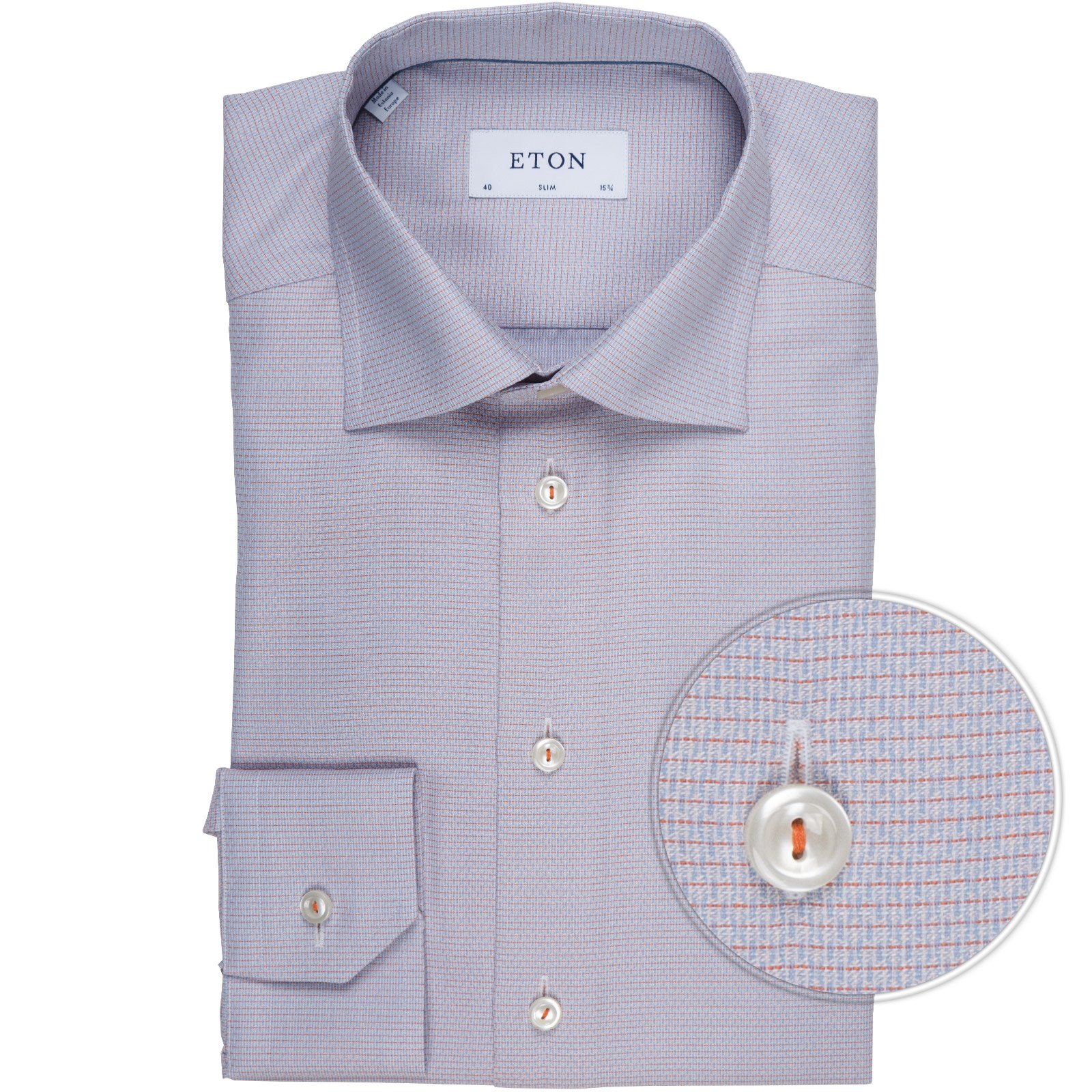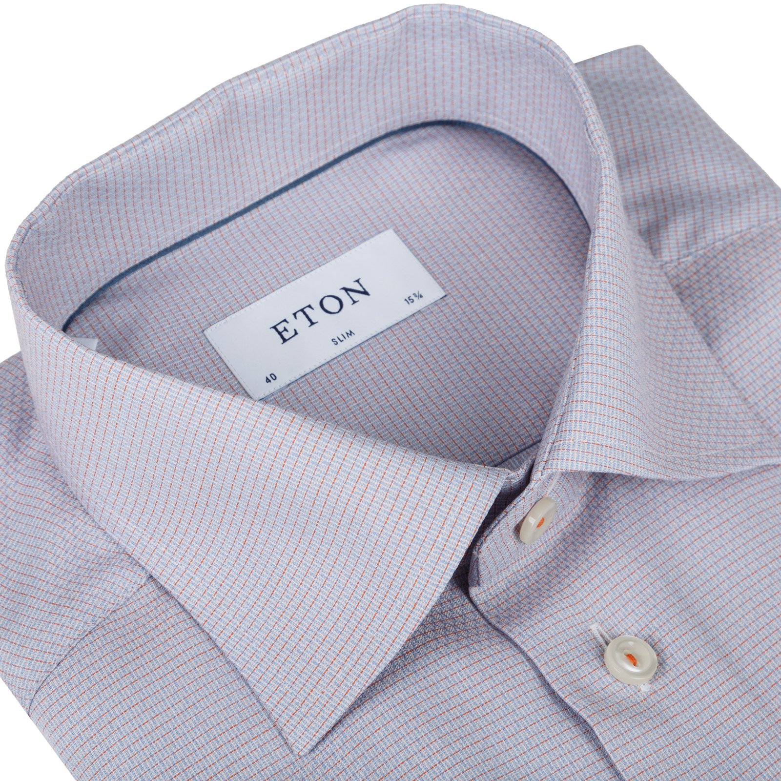 Slim fit dress shirt in a luxury cotton tonal micro check with colour matched stitching in the buttons. Features darts in the back for a tapered fit. Double button cuffs with extra button hole for cufflinks. Modern spread collar with fixed bones. Also available in Super Slim fit.