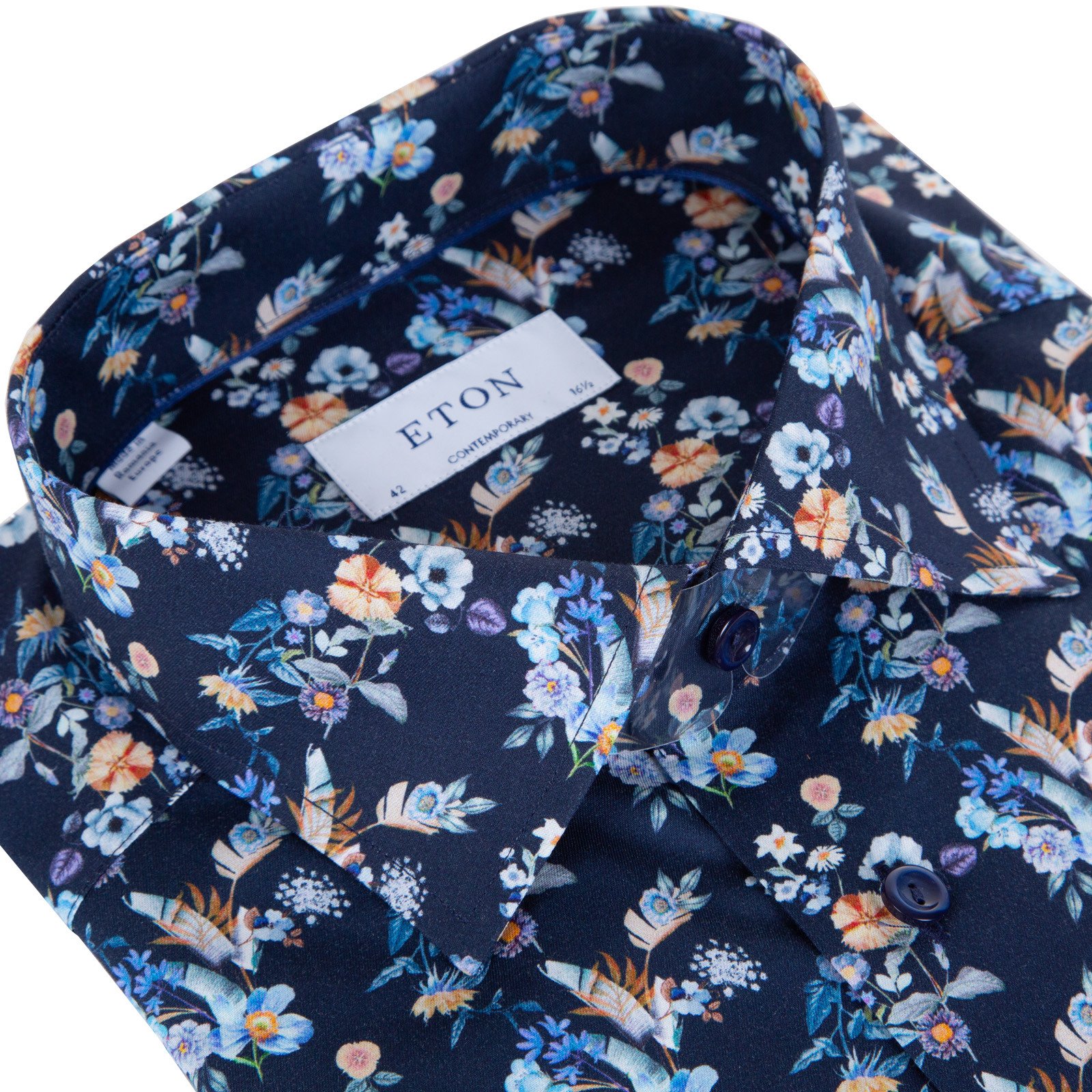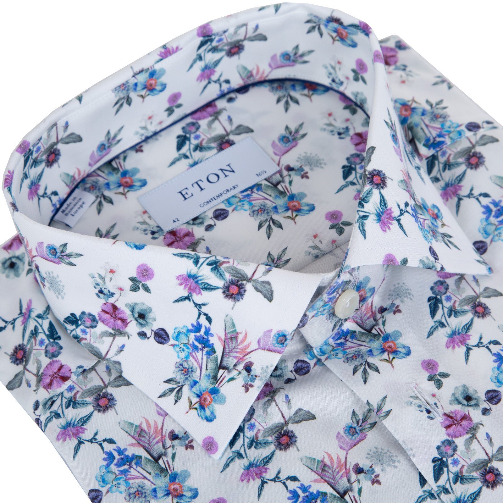 Contemporary fit dress shirt in a luxury cotton with a floral print. Features darts in the back for a slim tapered fit. Double button cuffs with extra button hole for cufflinks. Modern spread collar with fixed bones.