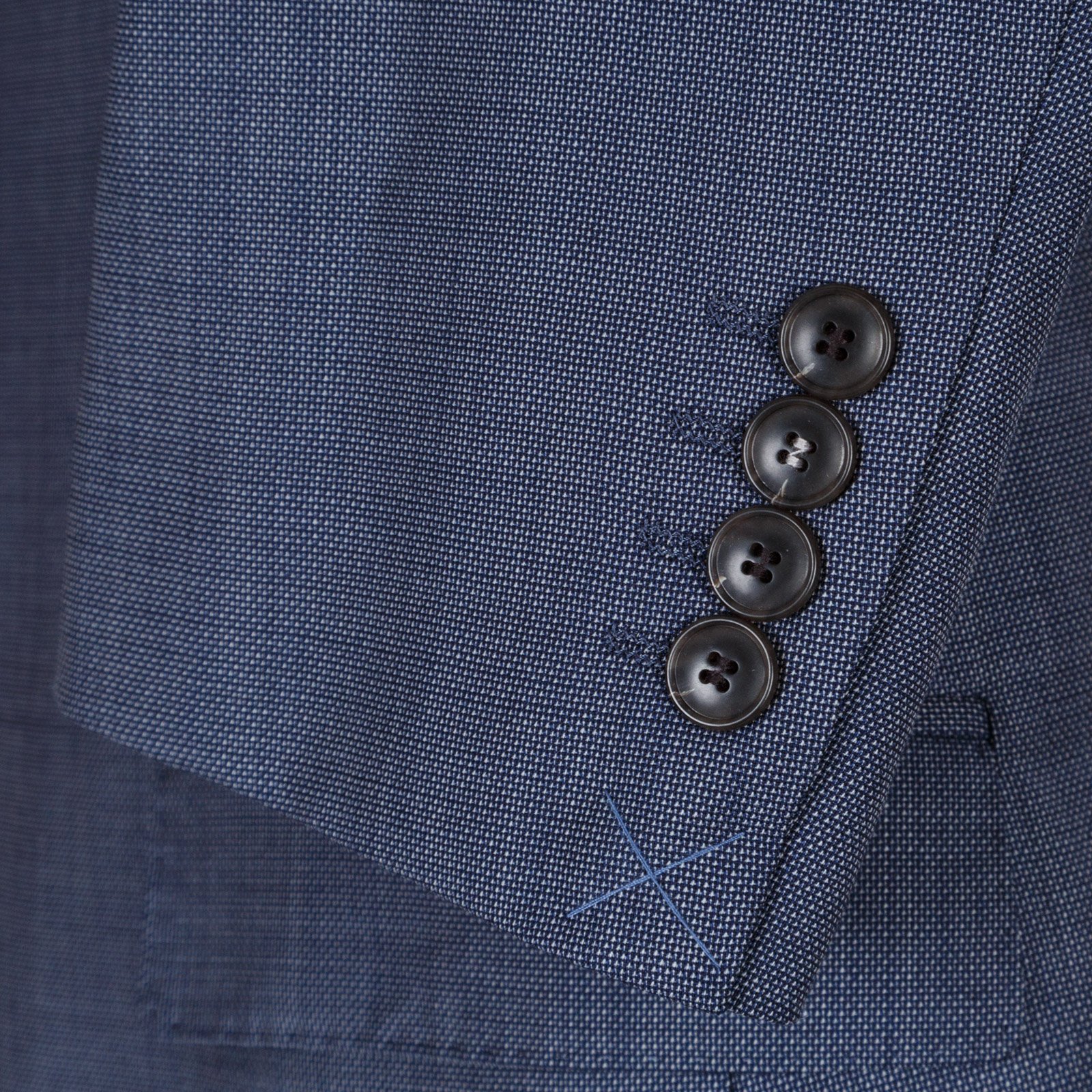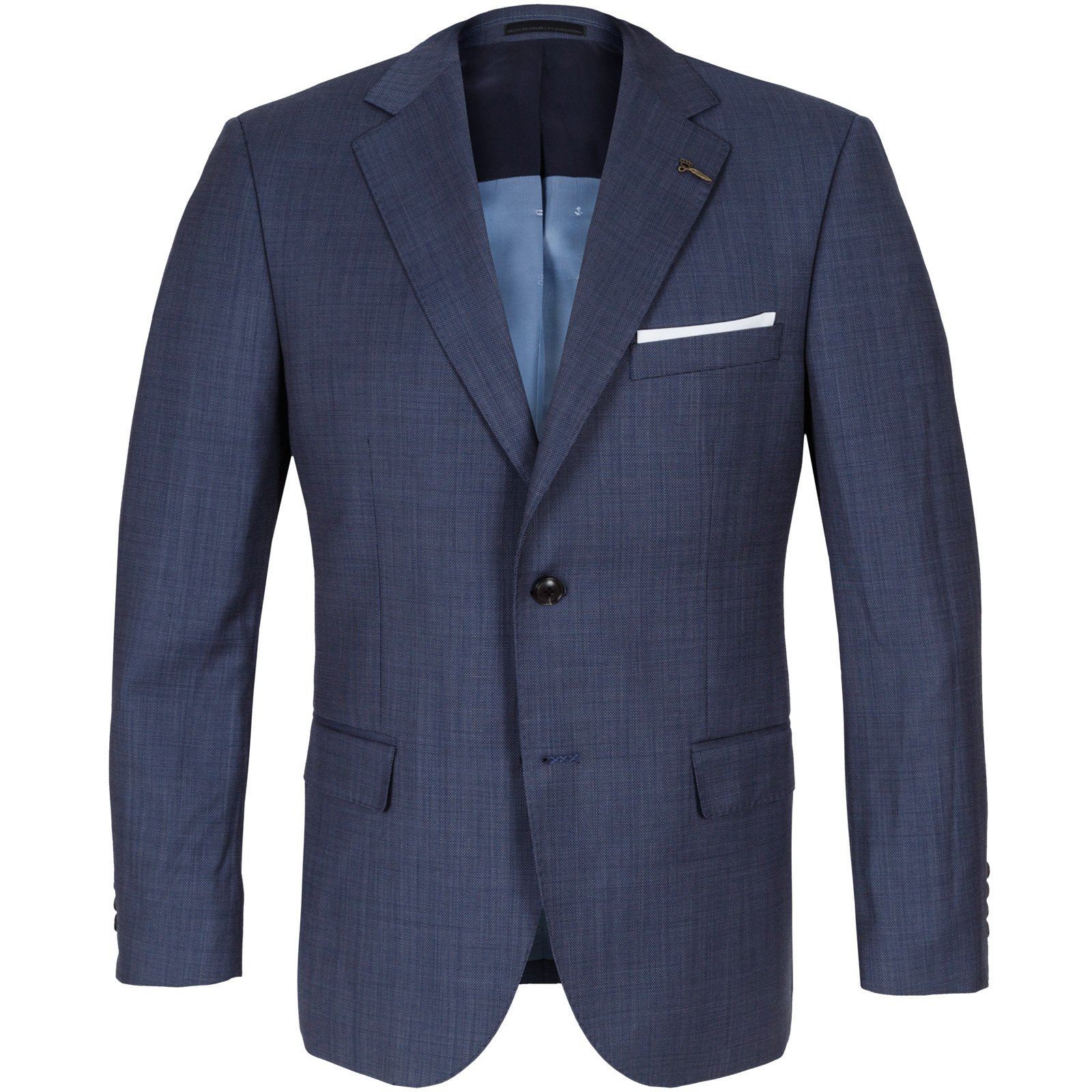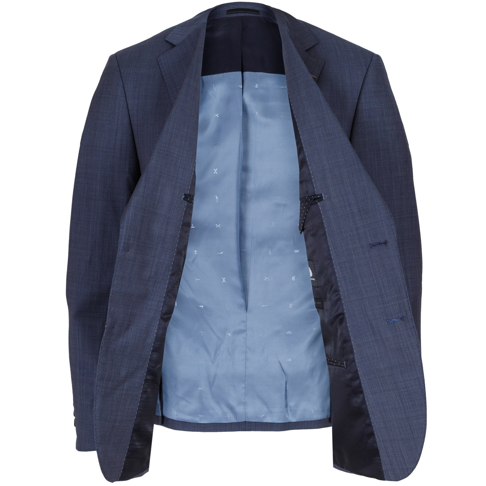 This subtle grey-blue pure wool suit, can also be worn as a sports jacket - teamed with navy or beige chinos. Fully lined with internal pockets and double vents.