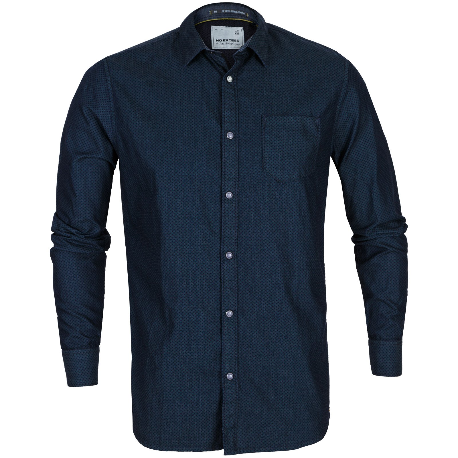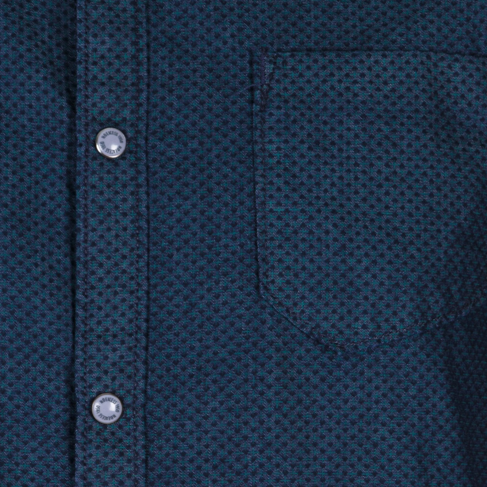 Features dome fastners and a 2-tone chmabrey with a subtle geomteric print.