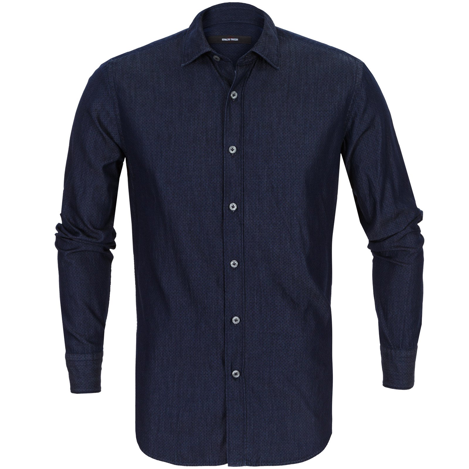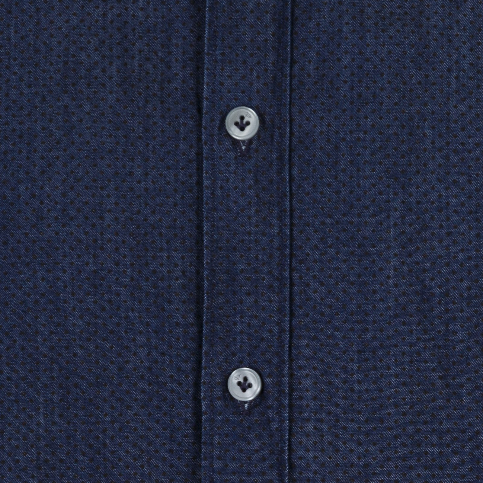 A light weight denim shirt with a fine print all over. Features darts in the back for a tapered fit, and soft fashion collar.
