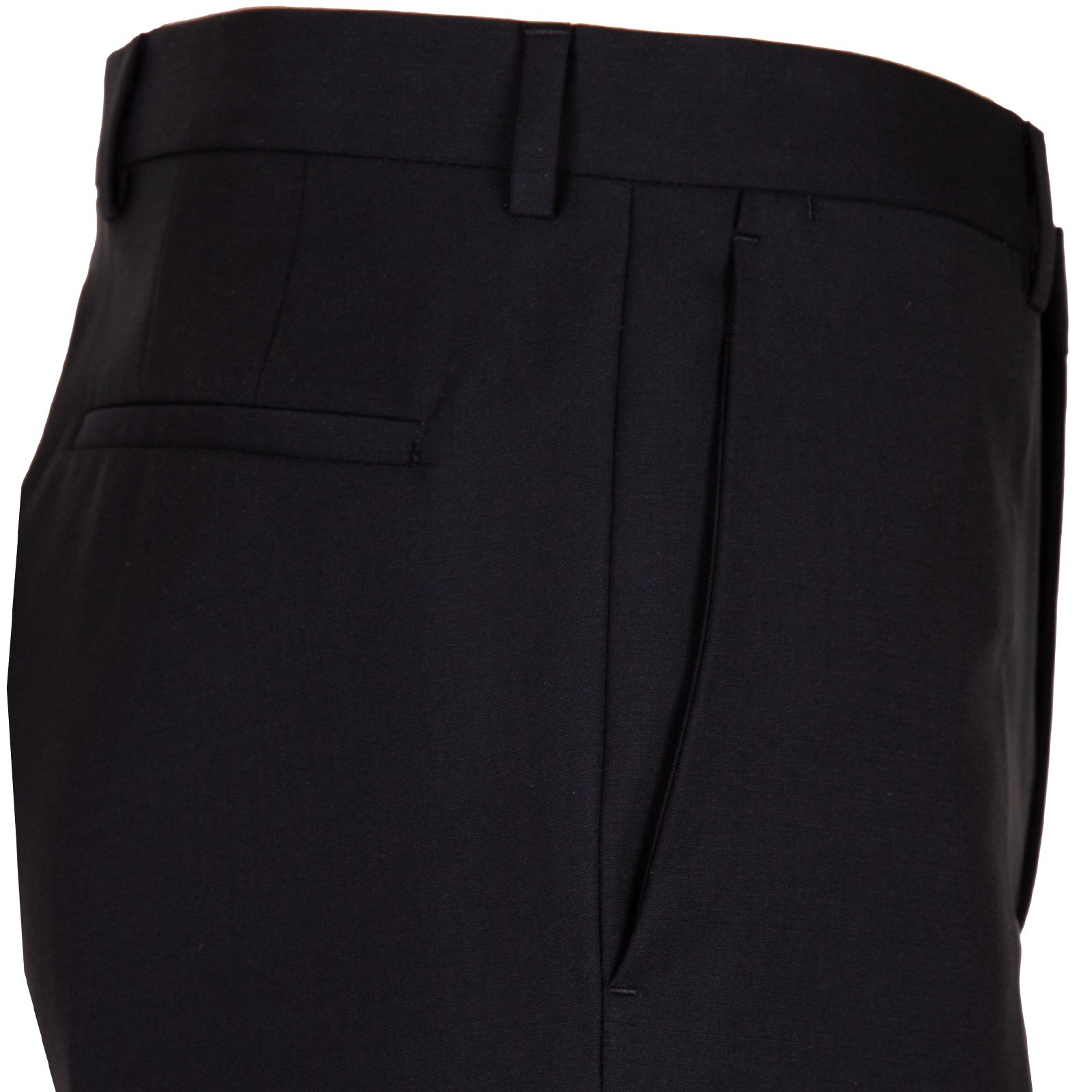 Trousers - Zip fly with hook-eye fastening, angled front pockets, rear jetted pockets with button fastening. Unfinished hems.