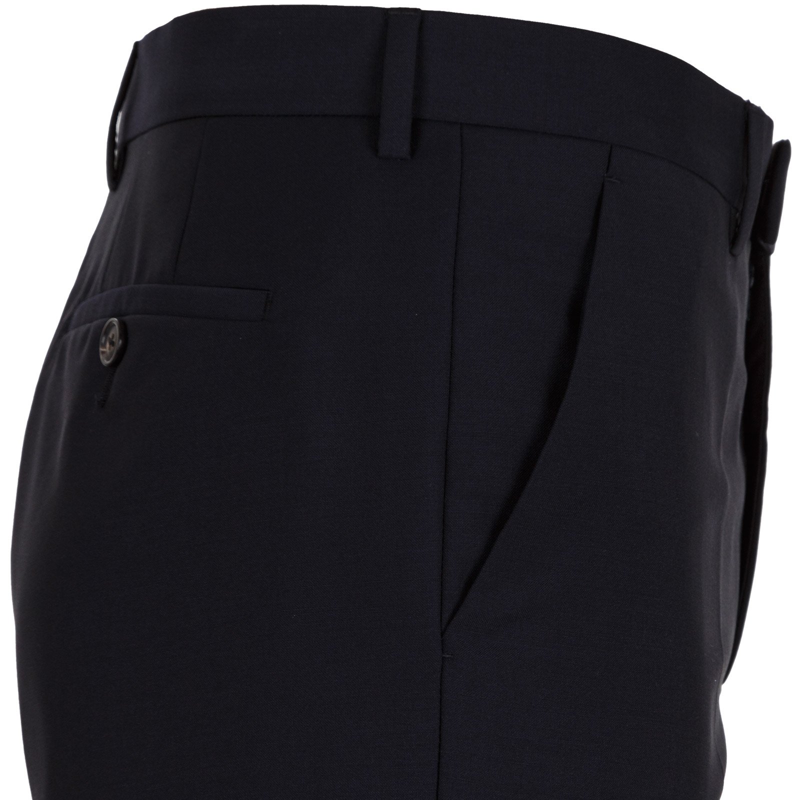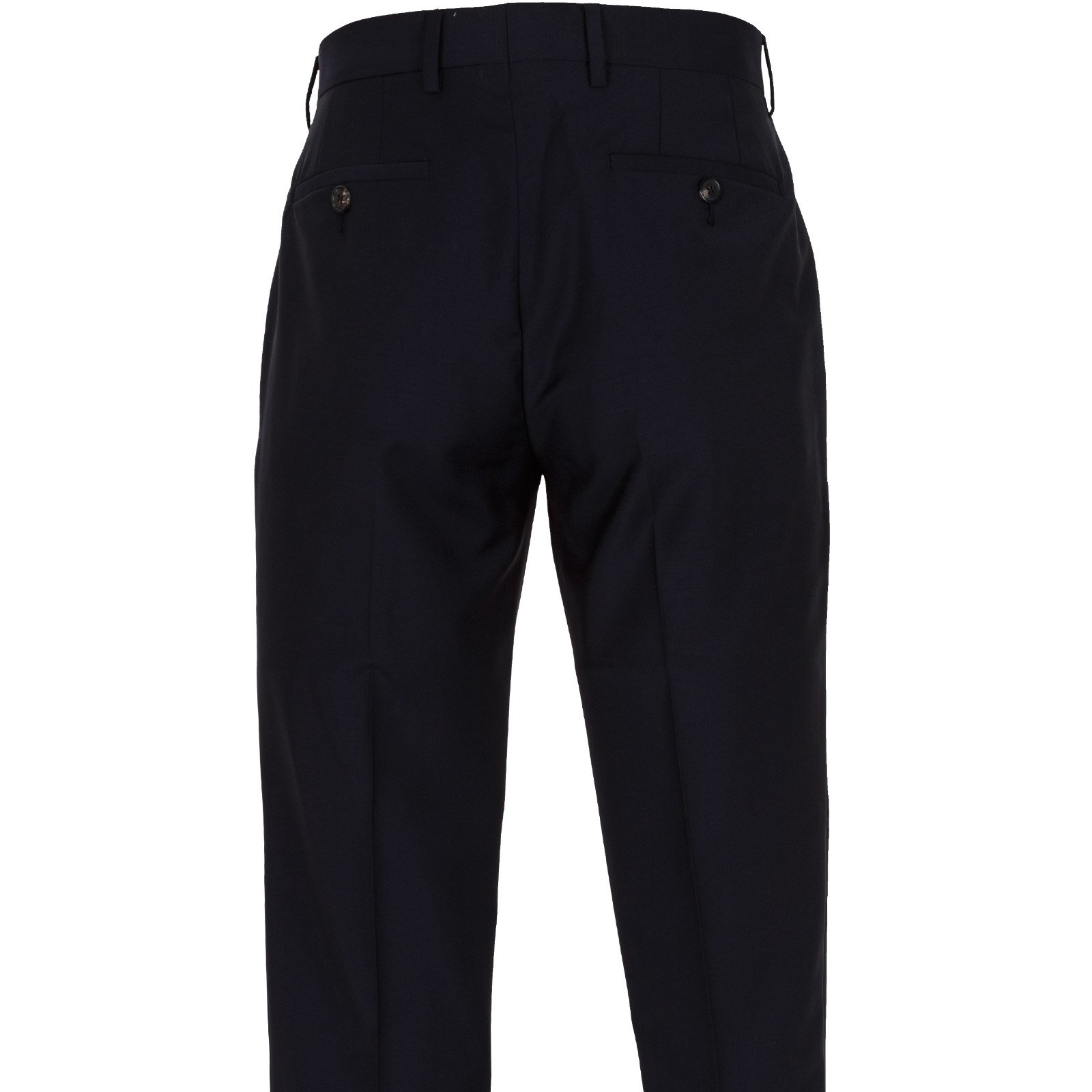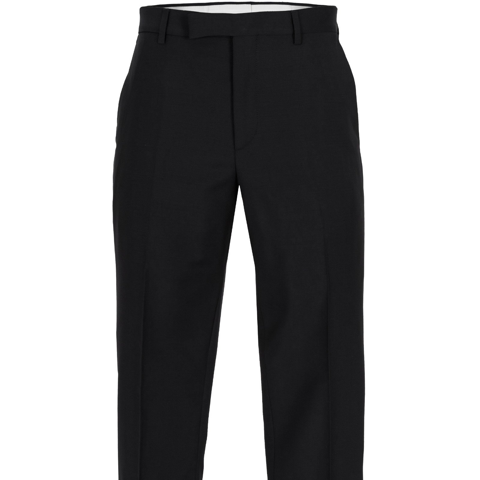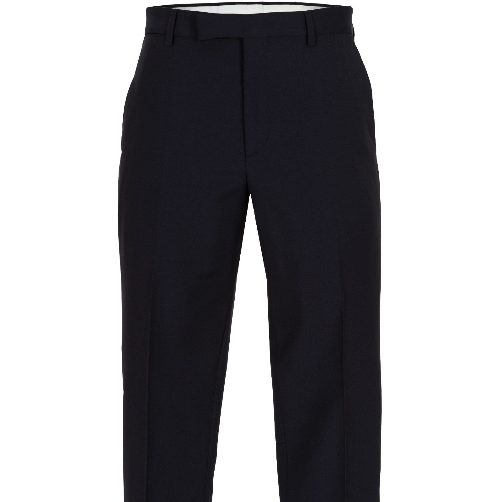 Trousers - Zip fly with hook-eye fastening, angled front pockets, rear jetted pockets with button fastening. Unfinished hems.