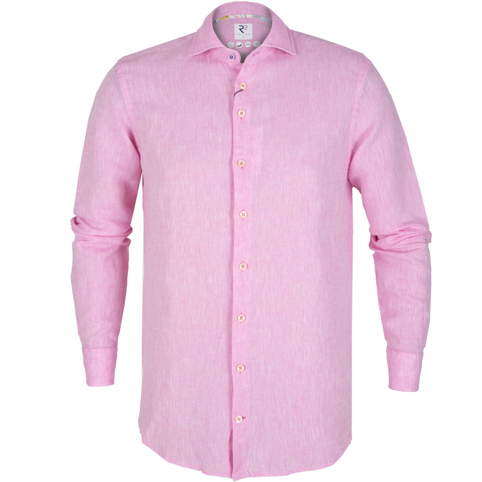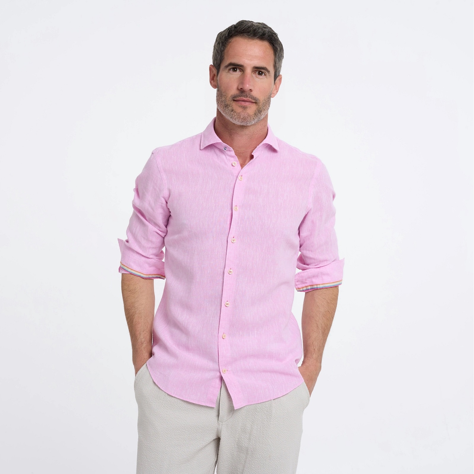 Luxury light-weight linen and cotton blend casual shirt with colourful trim in collar and cuffs. Features darts in the back for a tapered fit. Fashion soft cutaway collar, and slightly shorter length for a casual look that can be worn hanging out. Double button cuffs with pearl buttons.