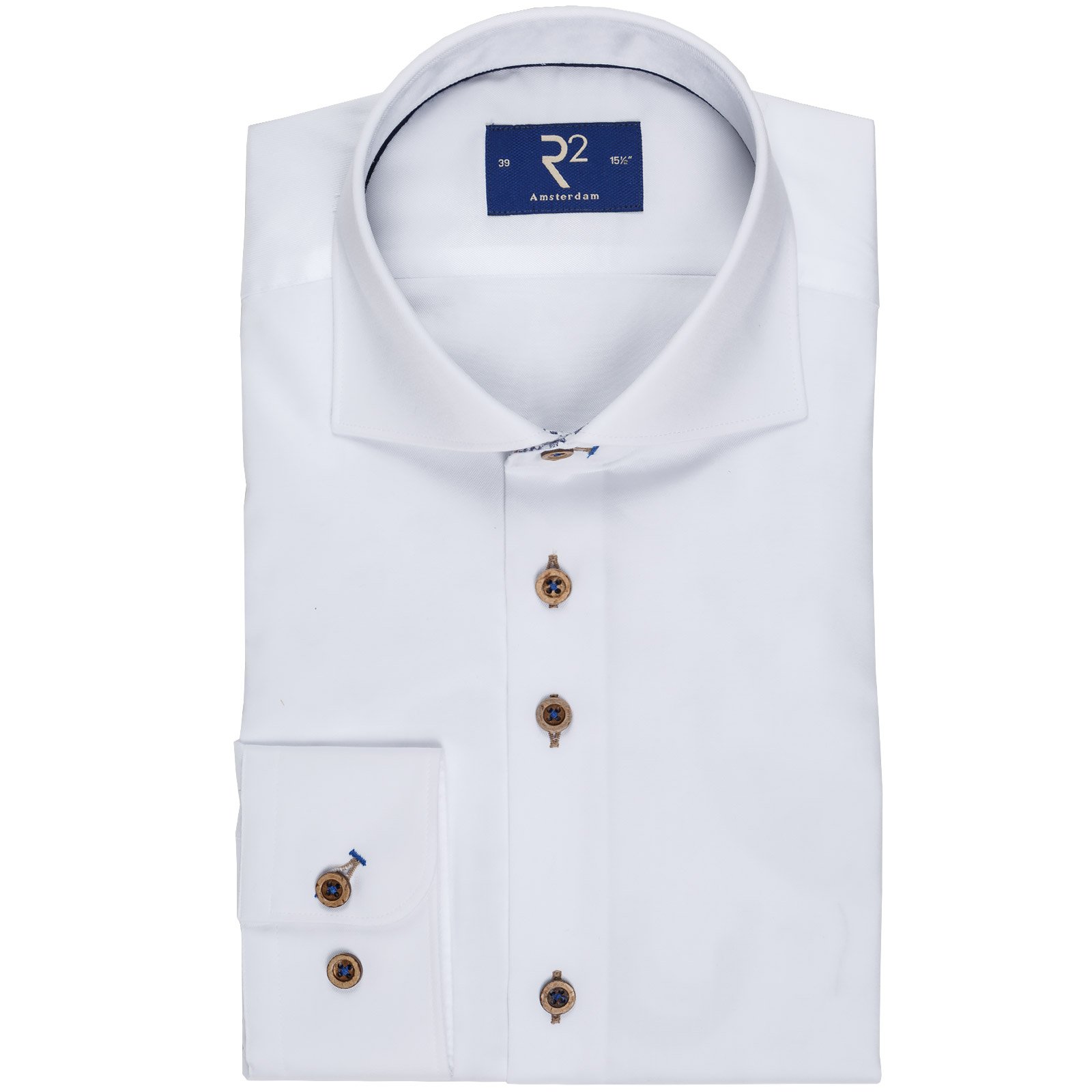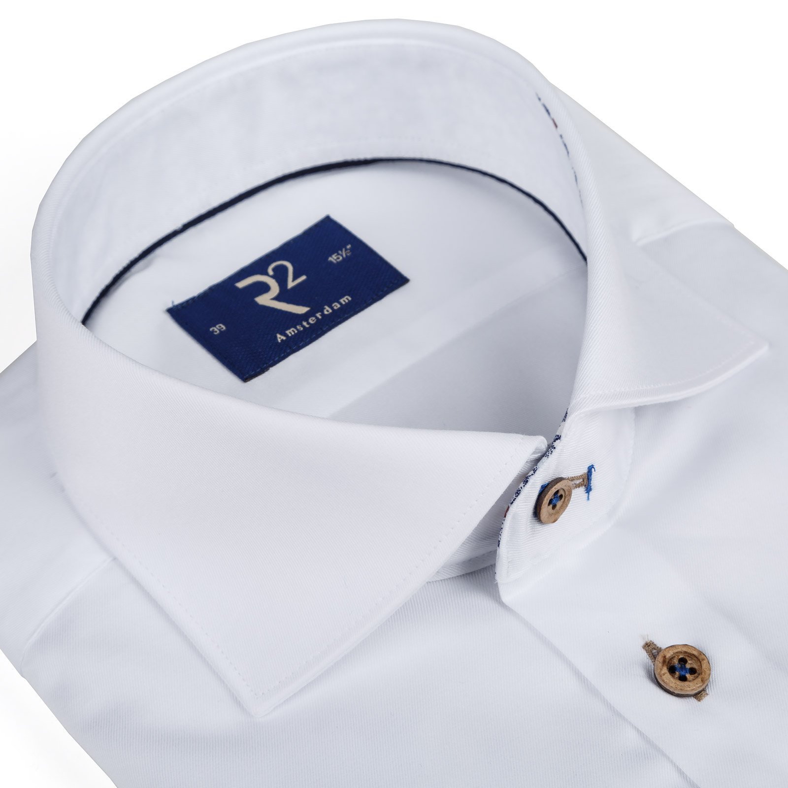 Features darts in the back for a tapered fit. Modern spread collar. Double button cuffs with contrast button detail.